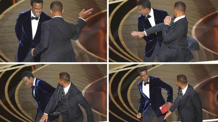 প্রথমে হাসিমুখে থাকলেও, পিংকেটের প্রতিক্রিয়ায় স্মিথ মেজাজ হারান। মুহূর্তেই মঞ্চে উঠে সপাটে চড় কষিয়ে দেন ক্রিসকে।
