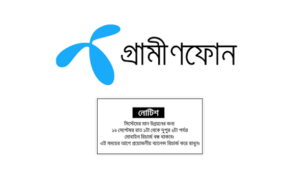 এদিকে গ্রামীণফোনের ওয়েবসাইটে দেওয়া এক নোটিশে বলা হয়েছে, ১৯ সেপ্টেম্বর গ্রামীণফোন এবং স্কিটোর সিস্টেমের মান উন্নয়নকাজের জন্য নিচের সার্ভিসগুলো সাময়িকভাবে বন্ধ থাকবে। প্রিপেইড রিচার্জ বন্ধ থাকবে রাত ১টা থেকে দুপুর ২টা পর্যন্ত; স্কিটো রিচার্জ বন্ধ থাকবে রাত ১টা থেকে দুপুর ২টা পর্যন্ত; পোস্টপেইড বিল পেমেন্ট এবং বিল আপডেট বন্ধ থাকবে রাত ১টা থেকে সন্ধ্যা ৬টা পর্যন্ত; প্রিপেইড থেকে পোস্টপেইড এবং পোস্টপেইড থেকে প্রিপেইড মাইগ্রেশন বন্ধ থাকবে রাত ১টা থেকে সন্ধ্যা ৬টা পর্যন্ত। তবে এই সময়ে প্রিপেইড গ্রাহকরা প্রয়োজন অনুযায়ী স্ক্র্যাচ কার্ড ব্যবহার করে রিচার্জ করতে পারবেন। মোবাইল ব্যালান্স দিয়ে প্যাক কিনতে পারবেন।