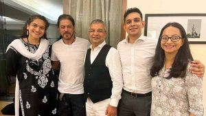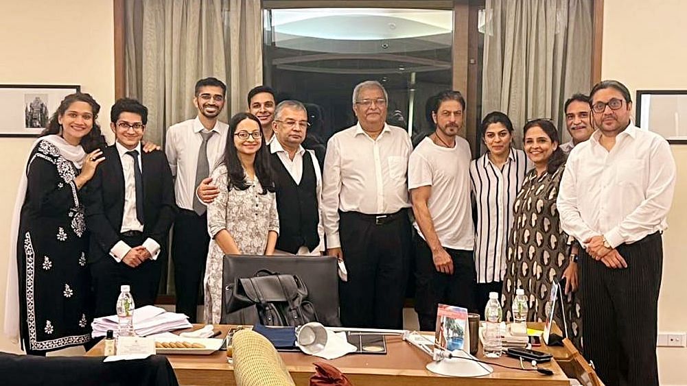 আরিয়ানের আইনজীবীদের সঙ্গে দেখা করতে গিয়ে বৃহস্পতিবার সন্ধ্যায় সতীশ মানশিন্ডে ও তাঁর জুনিয়র আইনজীবীদের সঙ্গে ক্যামেরাবন্দী হন শাহরুখ খান।
