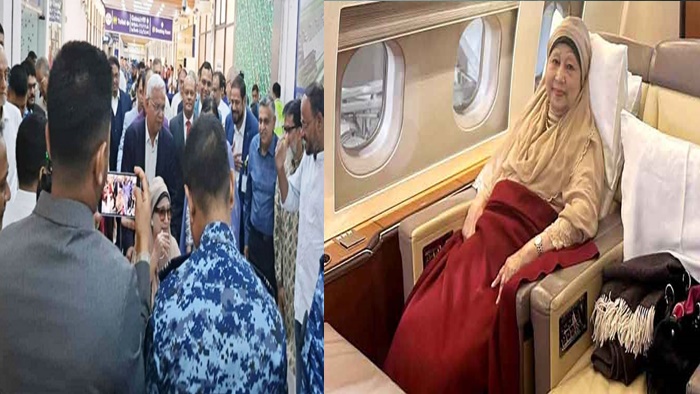 এর আগে লন্ডনের স্থানীয় সময় দুপুর দেড়টার দিকে বড় ছেলে বিএনপির ভারপ্রাপ্ত চেয়ারম্যান তারেক রহমান মাকে পাশে বসিয়ে গাড়ি চালিয়ে হিথরো বিমানবন্দরে যান। একই গাড়িতে দাদির পেছনে বসা ছিলেন তারেক রহমানের মেয়ে জাইমা রহমান। সেখানে আগে থেকে বিভিন্ন প্ল্যাকার্ড ও ব্যানার নিয়ে হাজারো নেতাকর্মী উপস্থিত ছিলেন।