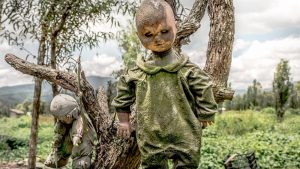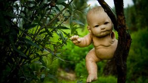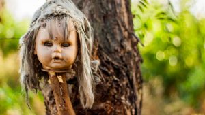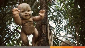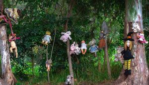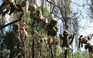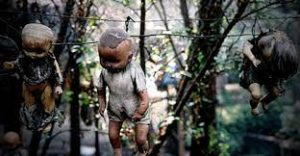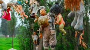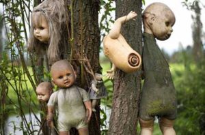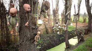 কেউ মুণ্ডহীন, কারও হাত-পা কাটা, কারও আবার সারা শরীর যেন কেউ ছিঁড়ে নিয়েছে। যতদূর চোখ যাবে এই দৃশ্যই চোখে পড়বে। ঘোর কাটলে বুঝতে পারবেন, ওগুলো আসলে পুতুল। সব গাছ থেকেই ঝুলছে ছোট-বড় এমন নানা চেহারার পুতুল।