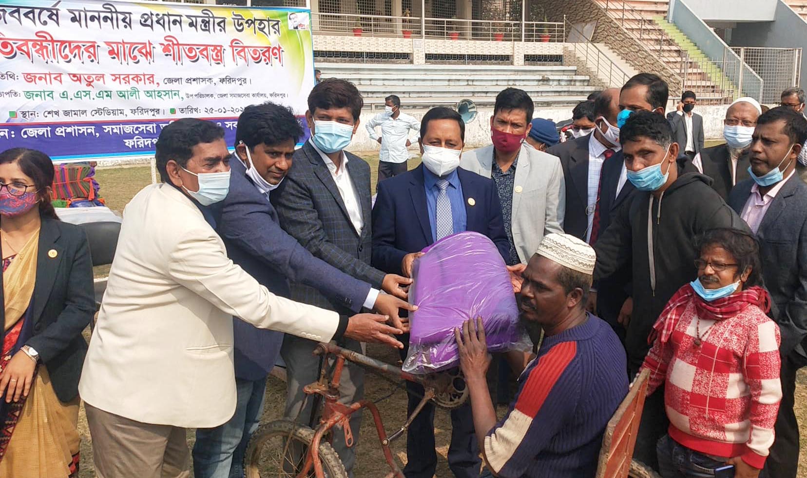মুজিববর্ষ উপলক্ষে ফরিদপুরের জেলা প্রশাসন, সমাজসেবা অধিদপ্তর ও এনজিওসমূহের আয়োজনে ফরিদপুরের ৮শ’ প্রতিবন্ধী নারী-পুরুষ ও শিশুদের মাঝে উন্নতমানের কম্বল বিতরণ করা হয়েছে। আজ সোমবার বেলা সাড়ে ১১টার দিকে ফরিদপুরের শেখ জামাল স্টেডিয়ামে সমবেত এসব প্রতিবন্ধীদের হাতে প্রধান অতিথি হিসেবে উপস্থিত থেকে কম্বল তুলে দেন ফরিদপুরের জেলা প্রশাসক অতুল সরকার।