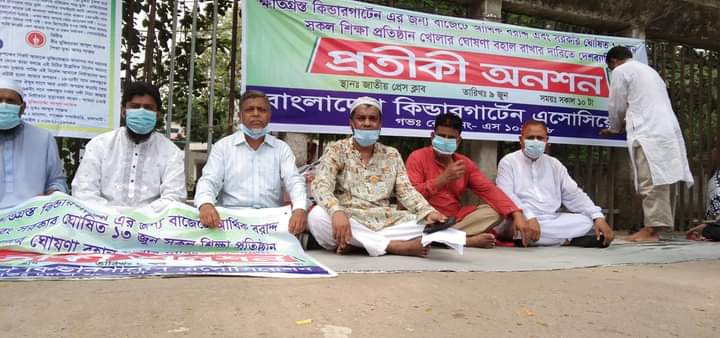 জুনে সরকার ঘোষিত শিক্ষা প্রতিষ্ঠান খোলার আদেশ বহাল রাখার দাবিতে বাংলাদেশ কিন্ডারগার্টেন এসোসিয়েশনের উদ্যোগে আজ জাতীয় প্রেসক্লাব সহ দেশের বিভিন্ন স্থানে প্রতীকী অনশন কর্মসূচি পালিত হয়। ঢাকা জাতীয় প্রেসক্লাবের সামনে এসোসিয়েশনের কেন্দ্রীয় কমিটির উদ্যোগে সংগঠনের চেয়ারম্যান মিসেস মনোয়ারা ভূঁইয়ার সভাপতিত্বে অনুষ্ঠিত হয়। উক্ত অনুষ্ঠানের লিখিত বক্তব্য পাঠ করেন সংগঠনের কেন্দ্রীয় মহাসচিব মিজানুর রহমান সরকার। মহাসচিব তার লিখিত বক্তব্যে বলেন, অনেক পরিচালক শিক্ষাপ্রতিষ্ঠান বন্ধ করতে বাধ্য হয়েছেন।