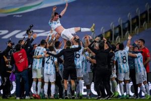 তার সতীর্থরাও কম যান নি। বছরখানেক আগে কোচ লিওনেল স্ক্যালোনি বলেছিলেন, আমরা জিততে চাই শুধুমাত্র মেসির জন্য। সতীর্থ পারেদেস, দি মারিয়া, অ্যাগুয়েরো হয়ে ক’দিন আগে অভিষেক হওয়া এমি মার্টিনেজ পর্যন্ত বলেছিলেন, মেসির জন্য আমরা জীবন দিতে প্রস্তুত। অধিনায়কের প্রতি সতীর্থদের অপরিসীম ভালোবাসা ফুল হয়ে ফুটিয়েছে একটি ট্রফি।