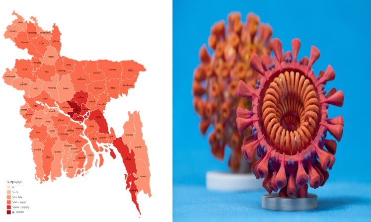 আইইডিসিআর ও বিশ্ব স্বাস্থ্য সংস্থার হিসাবে, বর্তমানে দেশের সব অর্থাৎ ৬৪ জেলা সংক্রমণের ‘রেড জোন’ বা ‘অতি উচ্চঝুঁকিতে’ রয়েছে। কারণ গত ২৪ ঘণ্টায় সারা দেশে সব জেলার মধ্যে সর্বোচ্চ ৫৮ শতাংশ ও সর্বনিম্ন ১৩ শতাংশ সংক্রমণ পাওয়া গেছে।