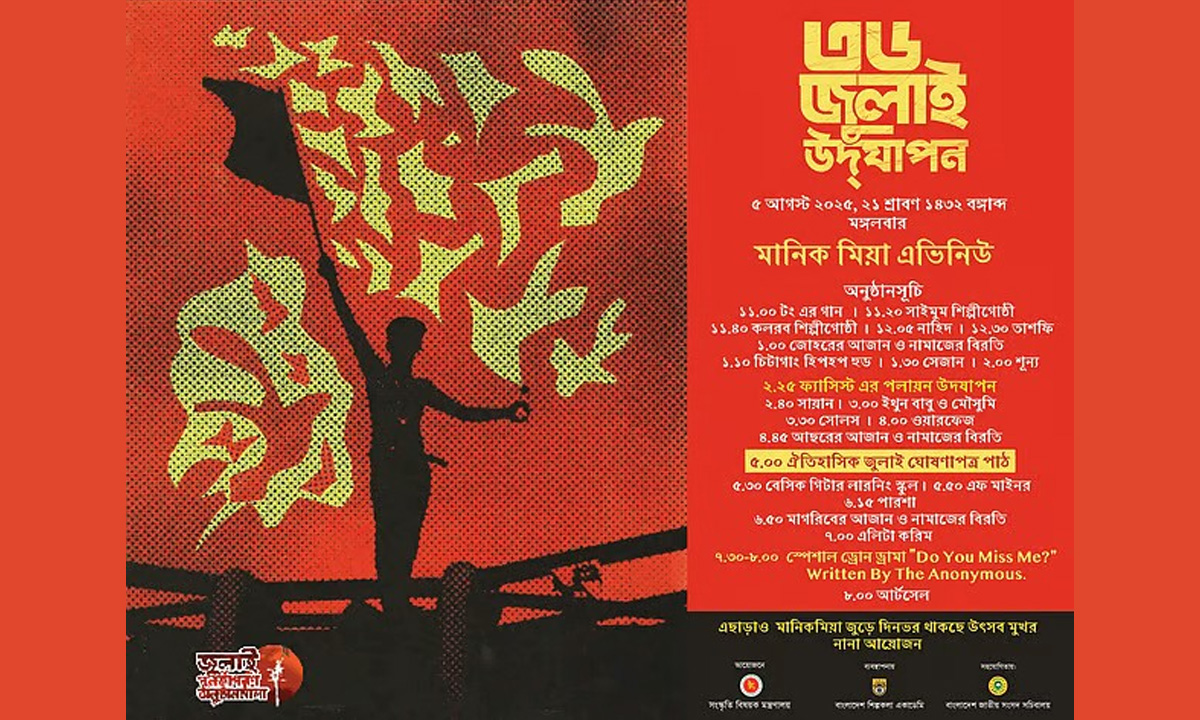 এ সময় উপস্থিত থাকবেন- প্রধান উপদেষ্টা প্রফেসর মুহাম্মদ ইউনূস। সবার অংশগ্রহণে জুলাই ঘোষণাপত্র পাঠ করা হবে। সন্ধ্যায় সংসদ ভবনের সামনে লাখো কণ্ঠে জুলাইয়ের গান ‘কতো বিপ্লবী বন্ধুর রক্তে রাঙা…” গাওয়া হবে।
